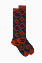 Calze lunghe da uomo in morbido cotone color bordò, decorate con un'elegante fantasia a rombi concentrici. Un accessorio distintivo che unisce comfort e originalità, firmato Gallo: eccellenza italiana dal 1927.