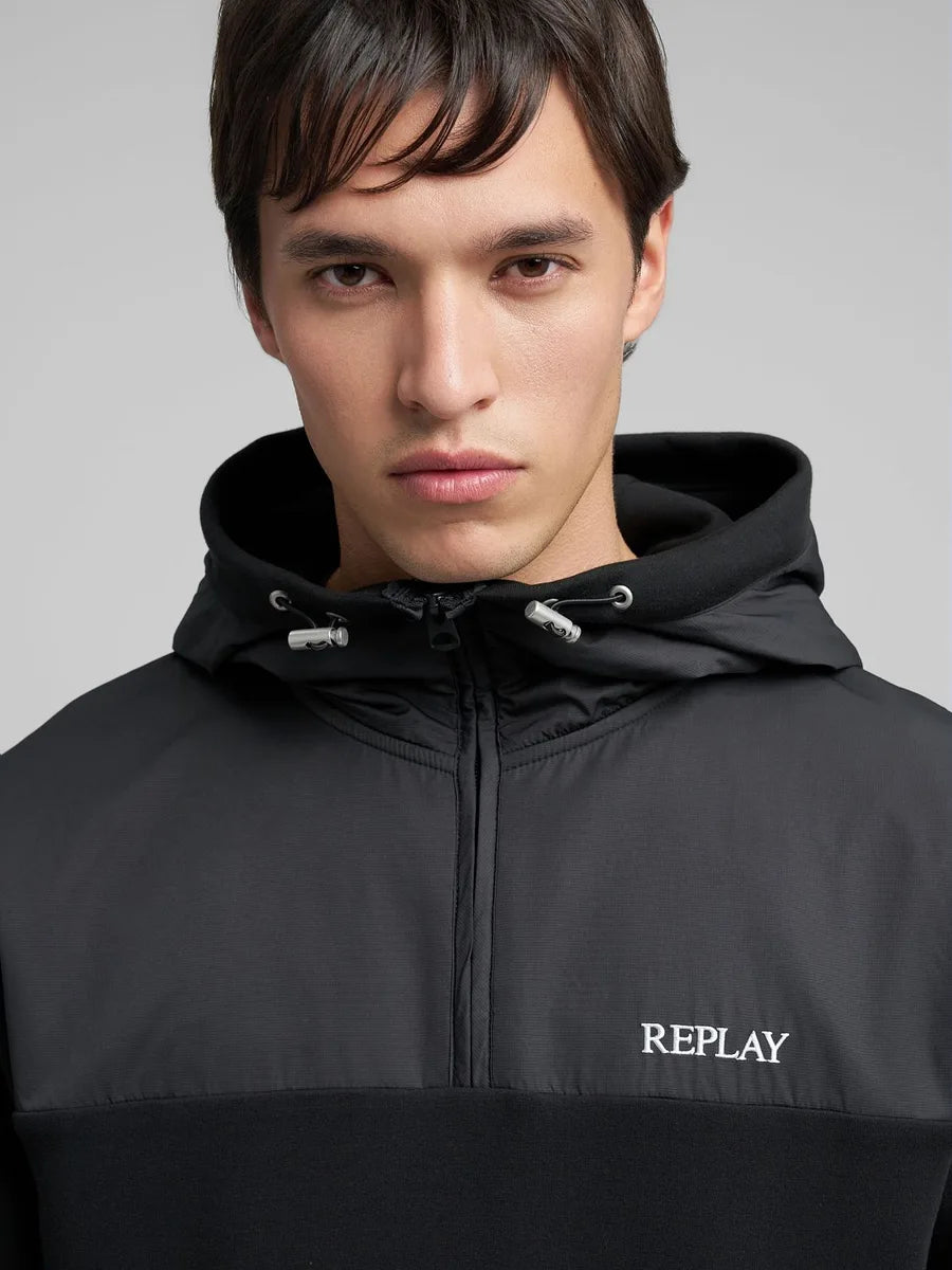 Felpa con cappuccio caratterizzata da un particolare design con rivestimento esterno del cappuccio, carré frontale e carré posteriore realizzati in tessuto tecnico, e interno del cappuccio, parte inferiore e maniche lunghe realizzati in misto cotone. Il modello amaniche lunghe dalla vestibilità regolare presenta una lavorazione a costine su girocollo, polsini e fondo capo e si distingue per il lettering ricamato a contrasto sul petto. Il design è completato da comode tasche laterali con zip, mentre il cappuccio, dotato di una chiusura frontale con mezza zip, può essere regolato tramite una coulisse interna con fermacorda.