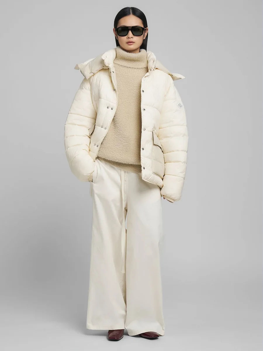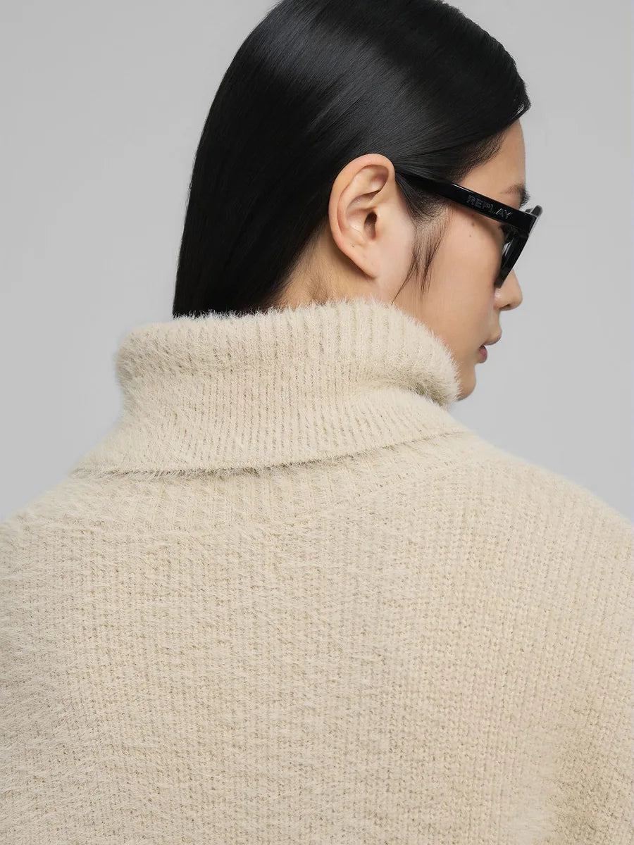Pullover a collo alto realizzato in filato tecnico effetto hairy, per una sensazione di comfort e morbidezza sulla pelle. Il modello smanicato si distingue per il giromanica molto ampio e per il fondo capo rimborsato con bordo a costine.