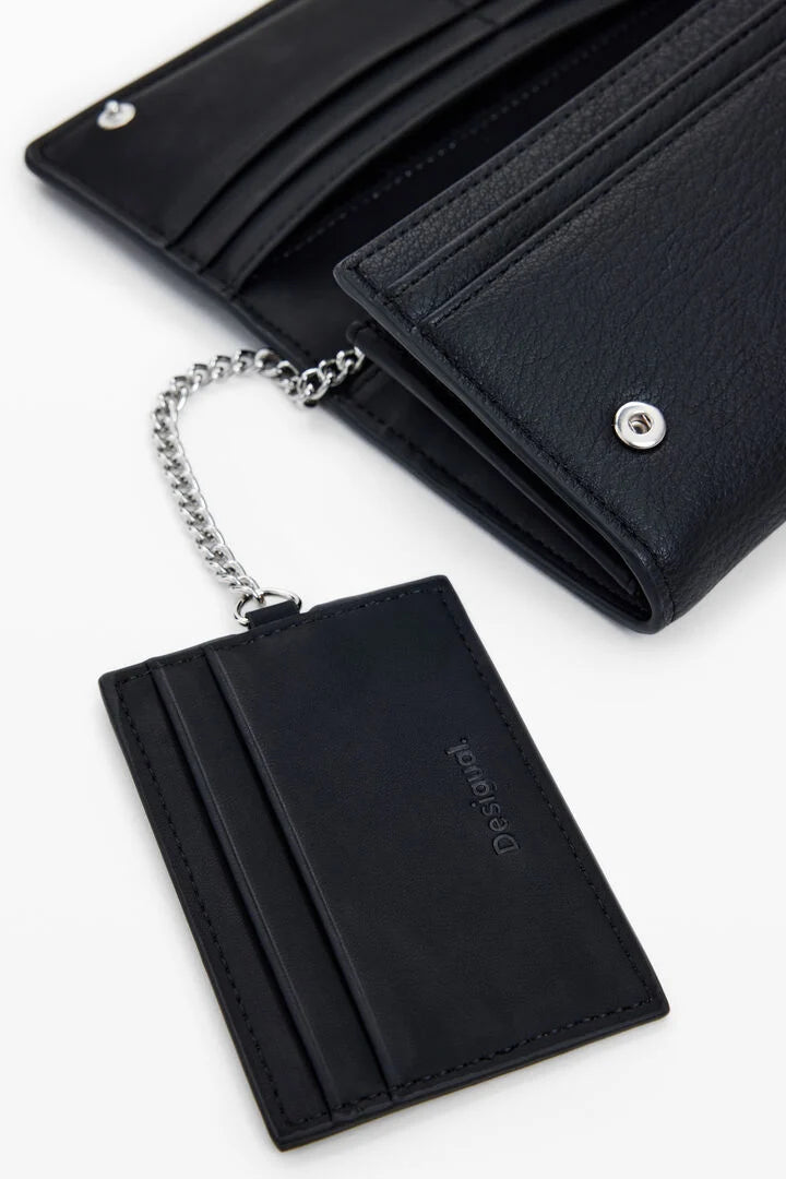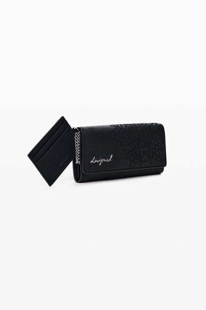 Portafoglio medio in tessuto effetto pelle, a tinta unita, con ricami a motivi ornamentali e portacarte estraibile.