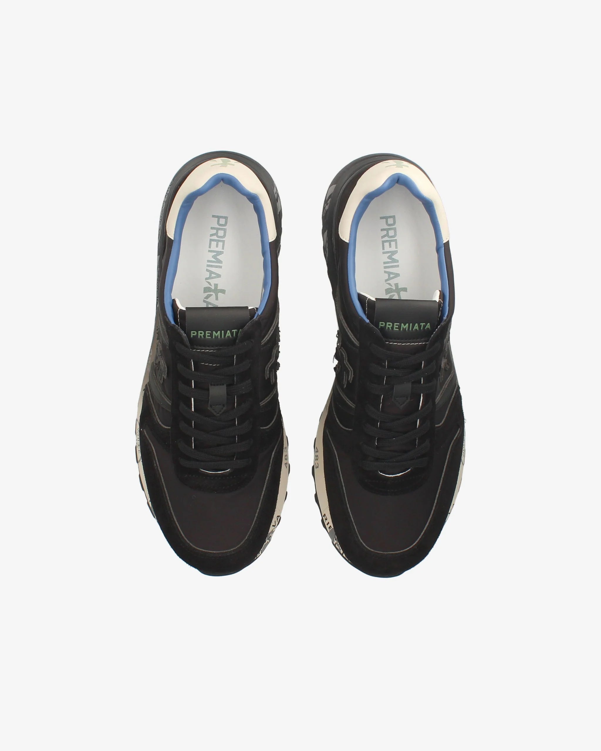 Sneakers Lander in pellame morbido scamosciato e nylon nella tonalità del nero. Il look è arricchito dall’inconfondibile logo Premiata e dai dettagli colorati sulla suola. Suola ergonomica e super leggera.