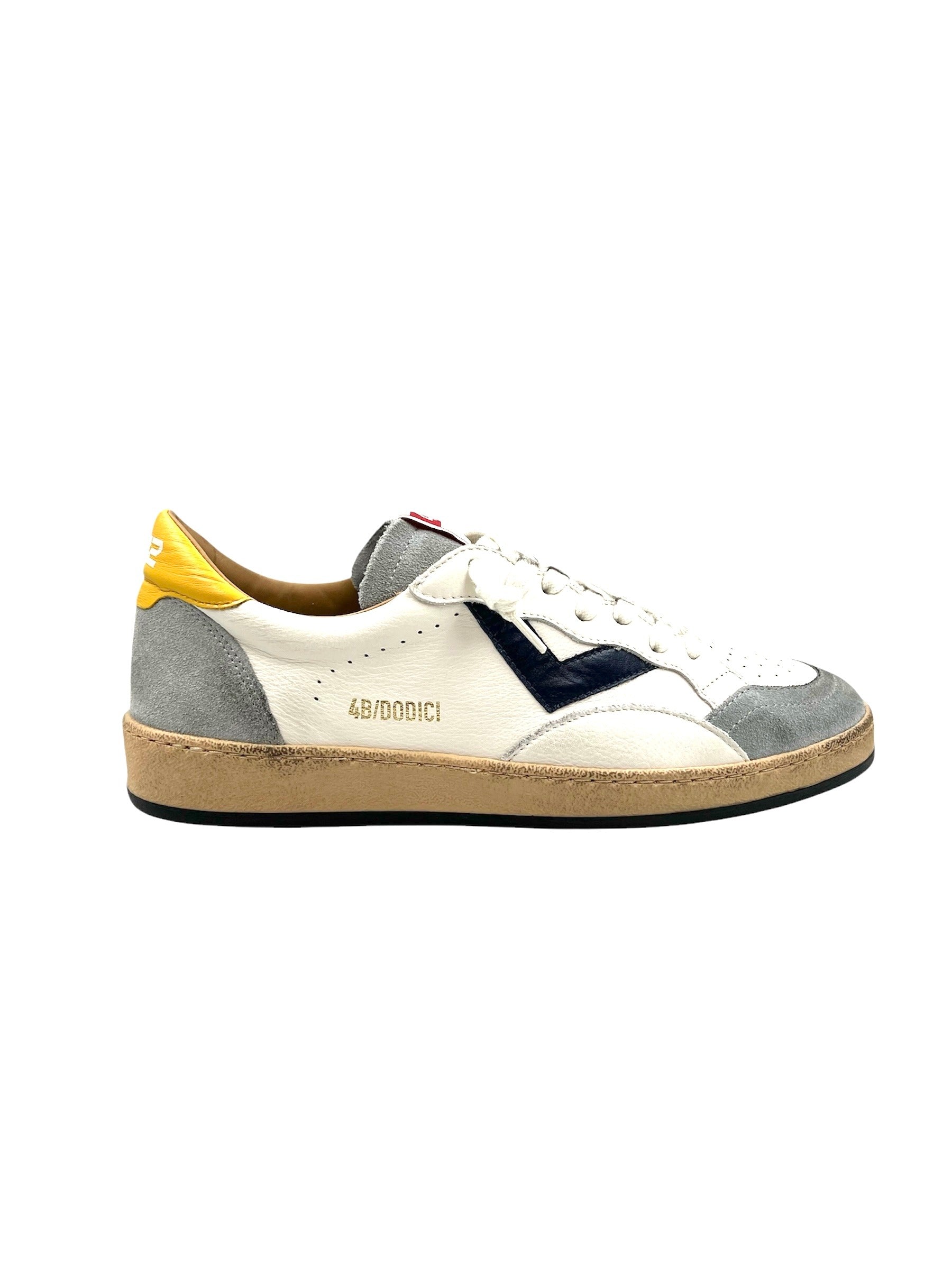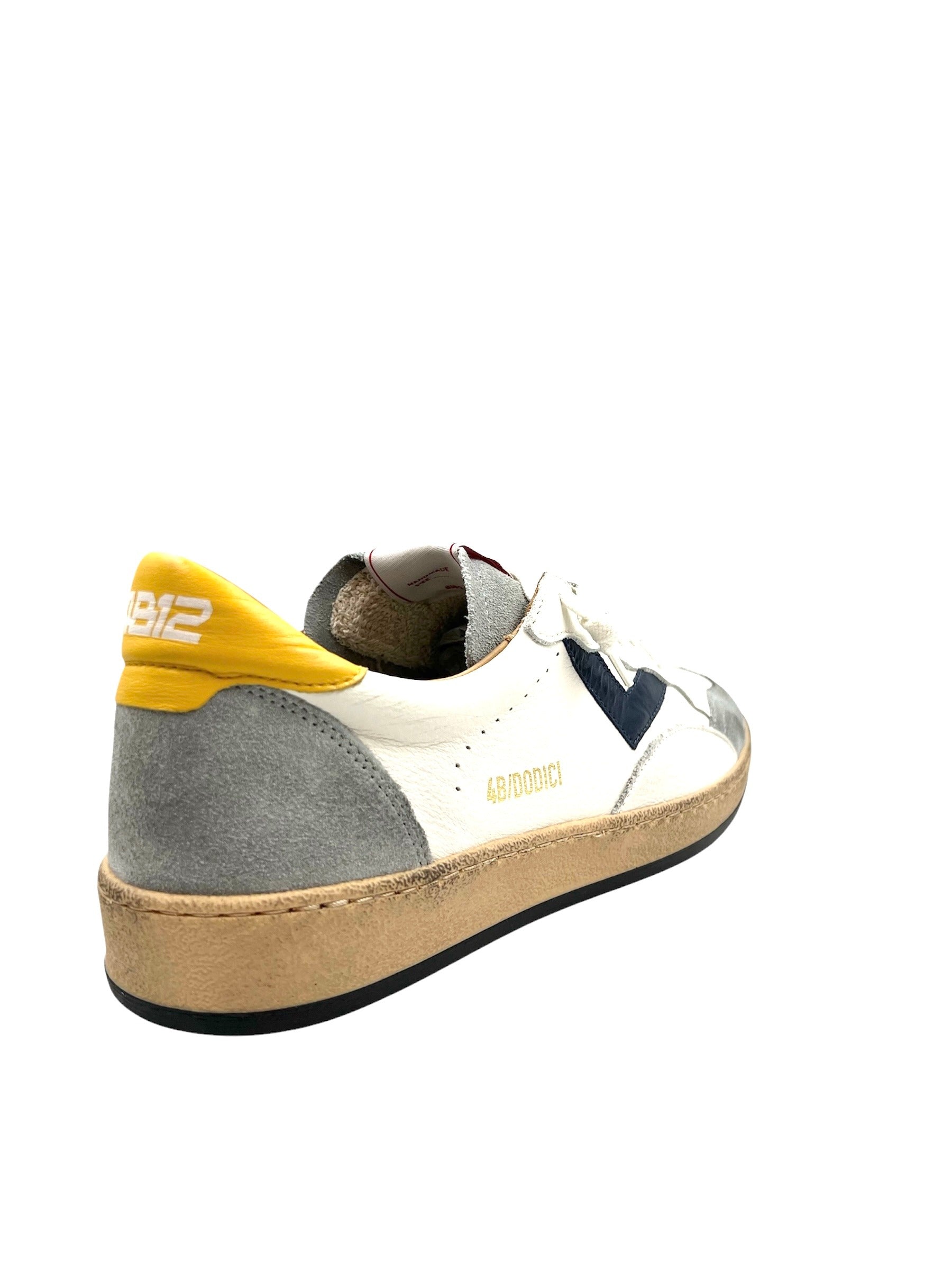 Sneakers 4B12 Vintage Styling In Pelle Bianca Camoscio Grigio e Con Inserti Blu e Giallo