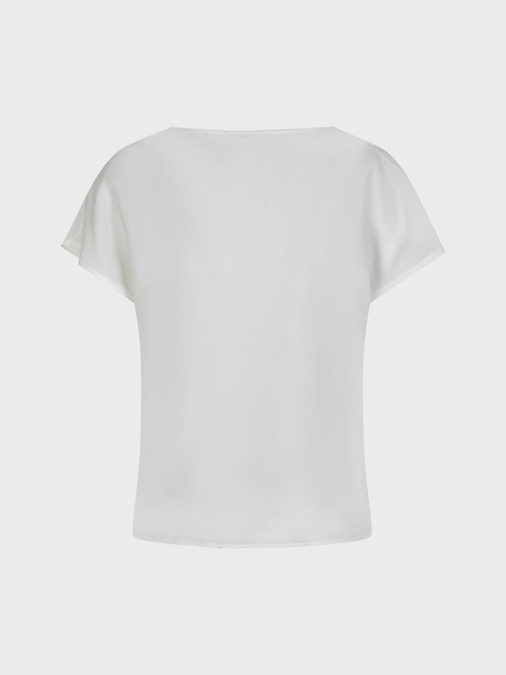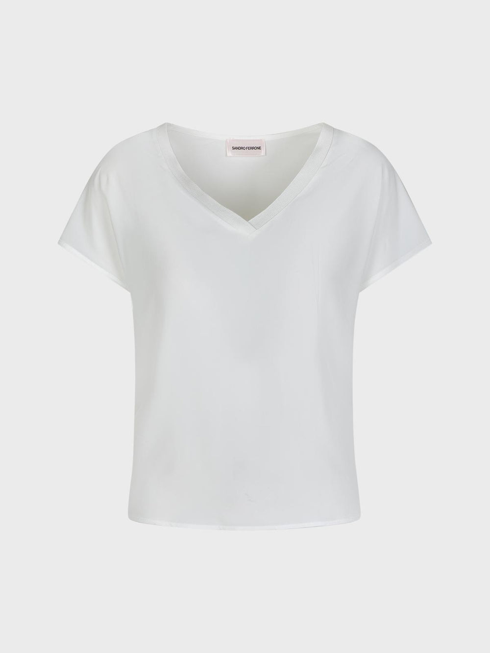 Blusa in crepe de chine in acetato seta con scollo v, manica a chimoncino e finiture in viscosa a costina smacchinate