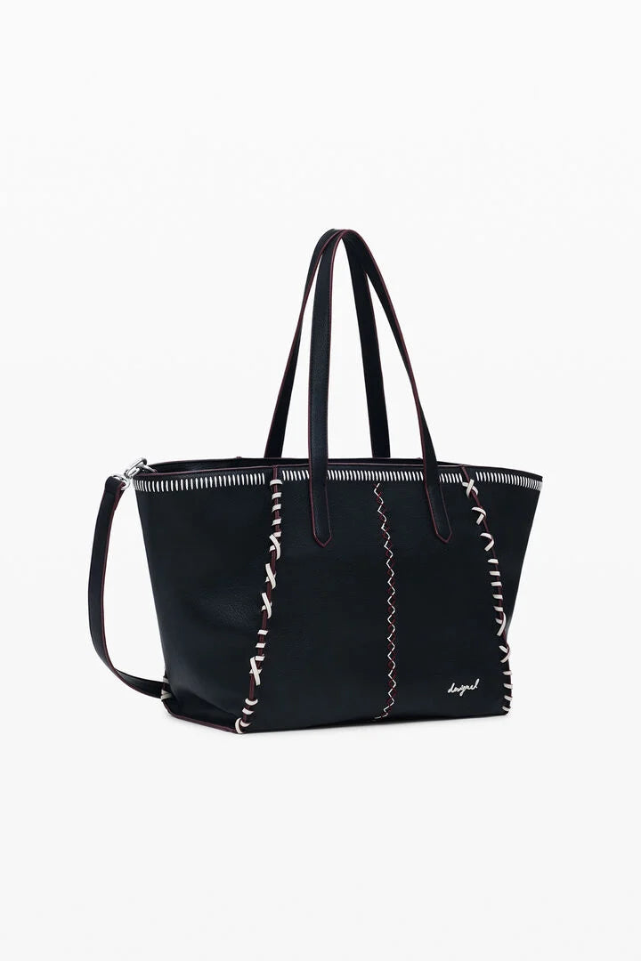 Borsa stile shopper in tessuto effetto pelle, di grande capacità, con tracolla removibile e chiusura con cerniera, con dettaglio di cuciture e ricami decorativi.