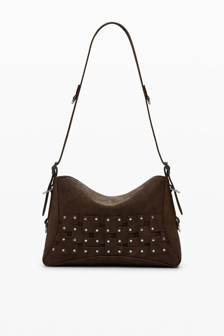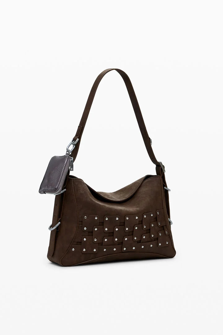 Borsa a mano stile patchwork, in tessuto effetto pelle, con dettaglio di borchie metalliche, manico regolabile e dettaglio di portamonete estraibile.