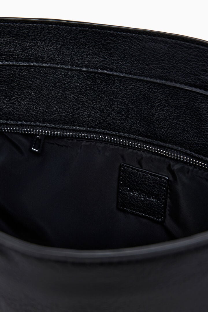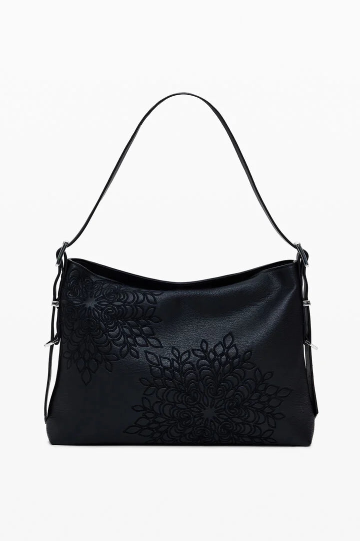 Borsa a spalla in tessuto effetto pelle, con ricami ornamentali, chiusura con cerniera, dettaglio di portachiavi rimovibile e tracolla regolabile.