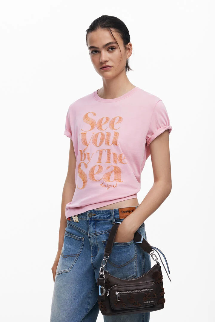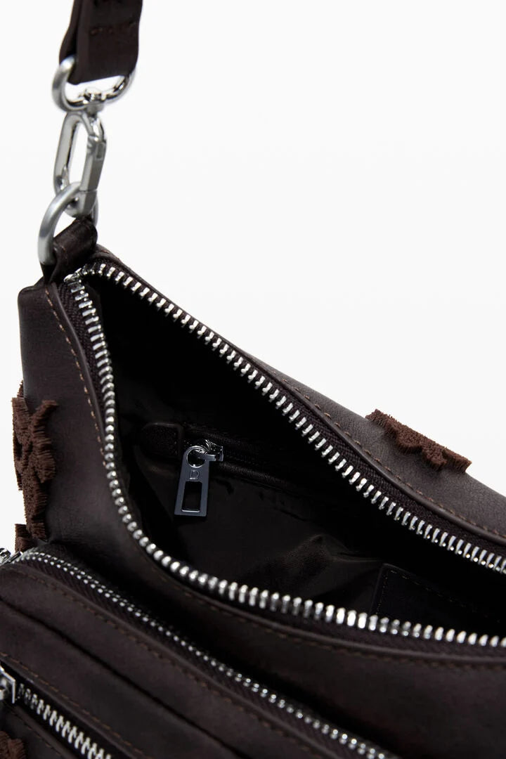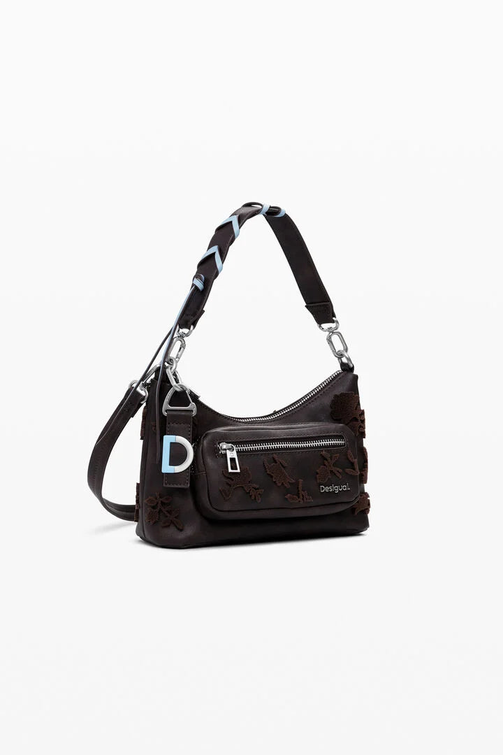 Borsa a tracolla, effetto consumato, con applicazioni floreali, tasche con cerniera e portachiavi metallico rimovibile.