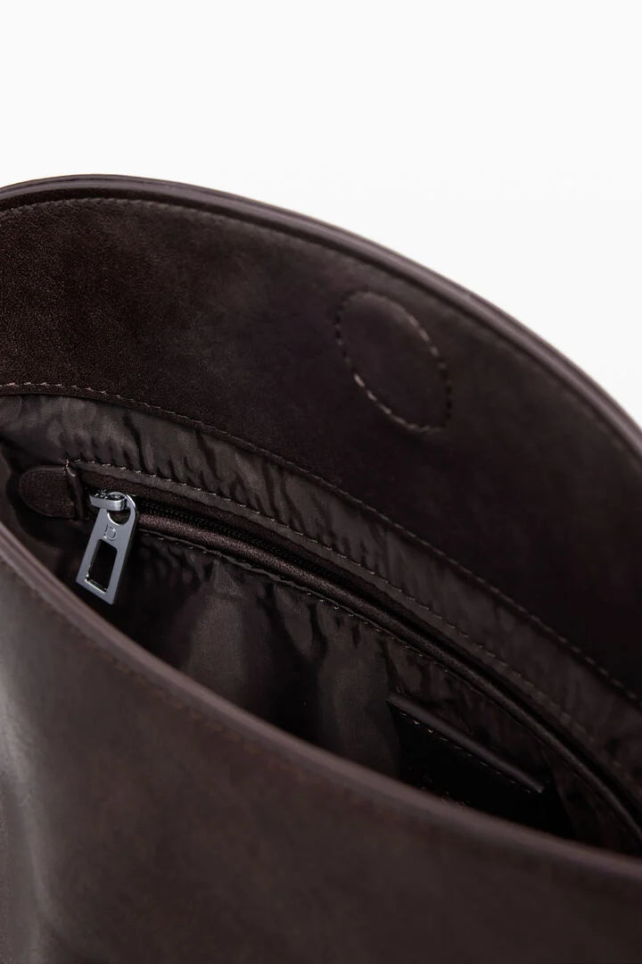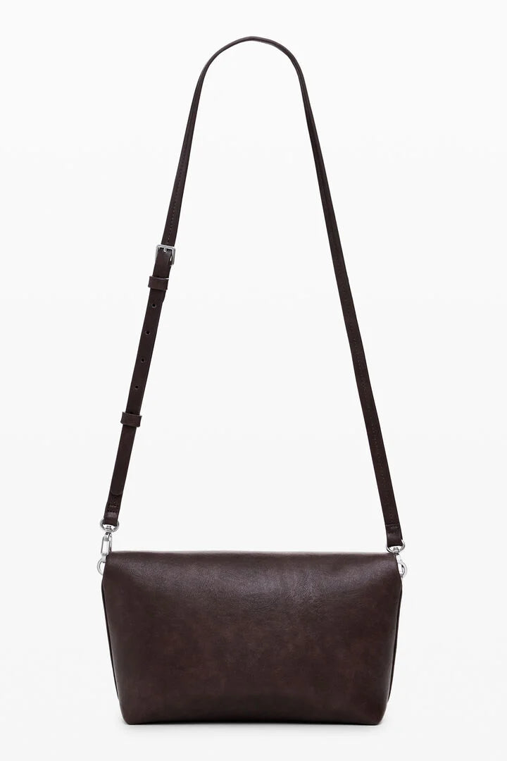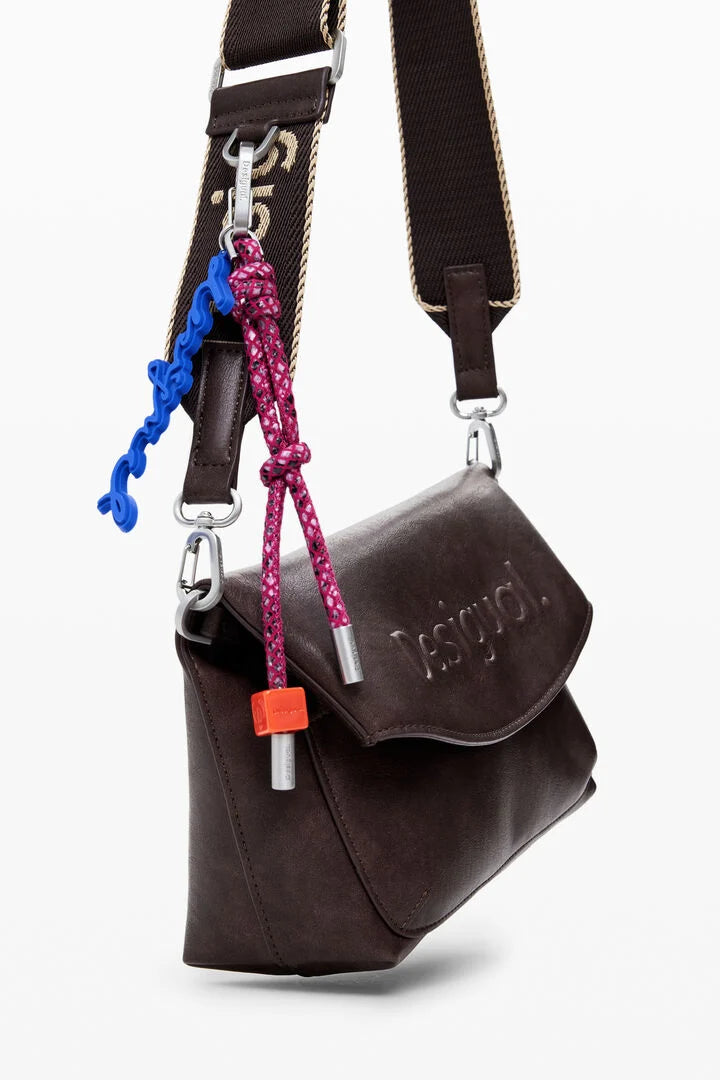 Borsa a tracolla in tessuto effetto pelle, imitazione camoscio, logo effetto 3D, patta estensibile, dettaglio portachiavi e manici intercambiabili.